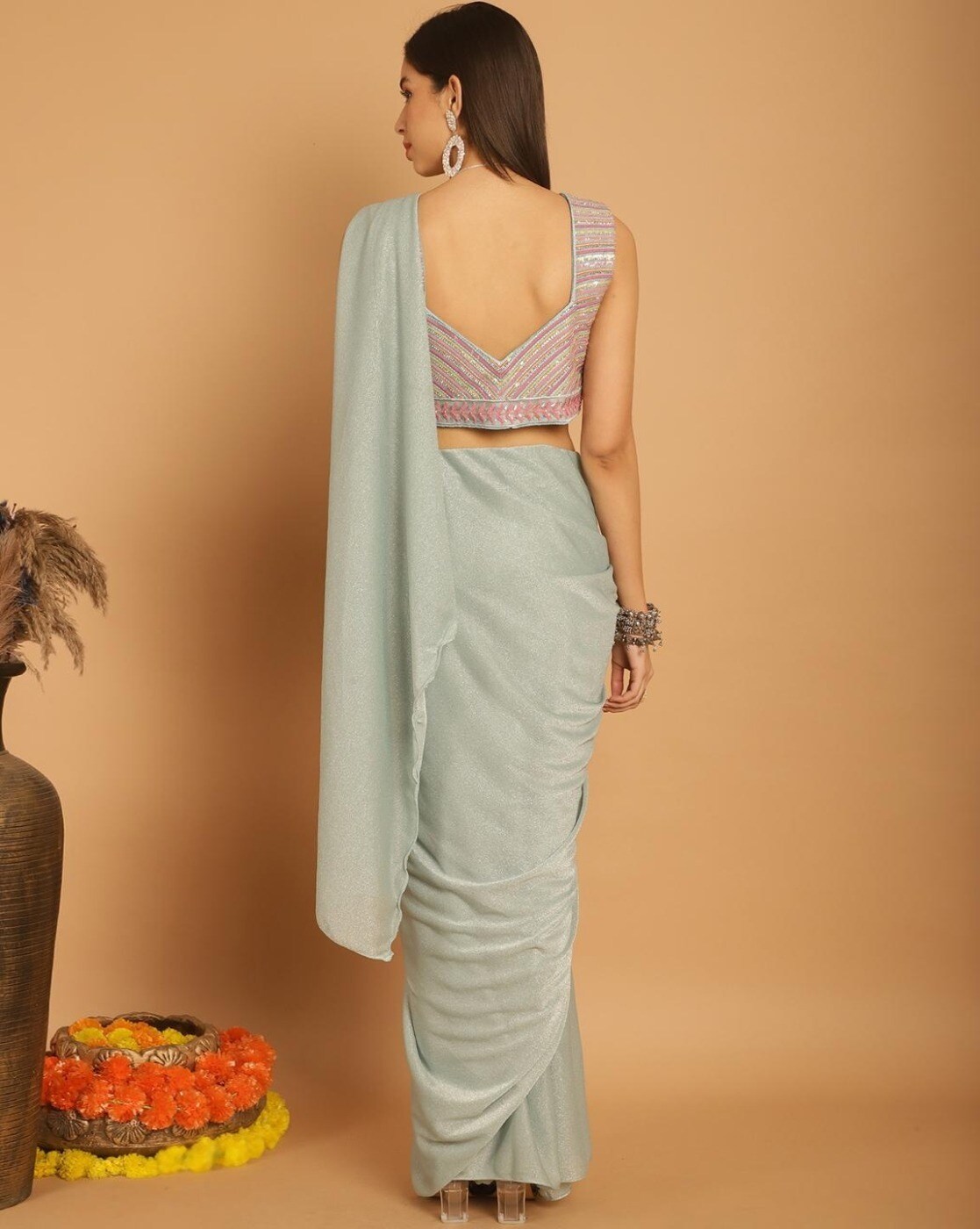 • The last image gives a detailed look of the blouse piece that comes with this saree (The model is wearing a blouse from our in-house wardrobe)