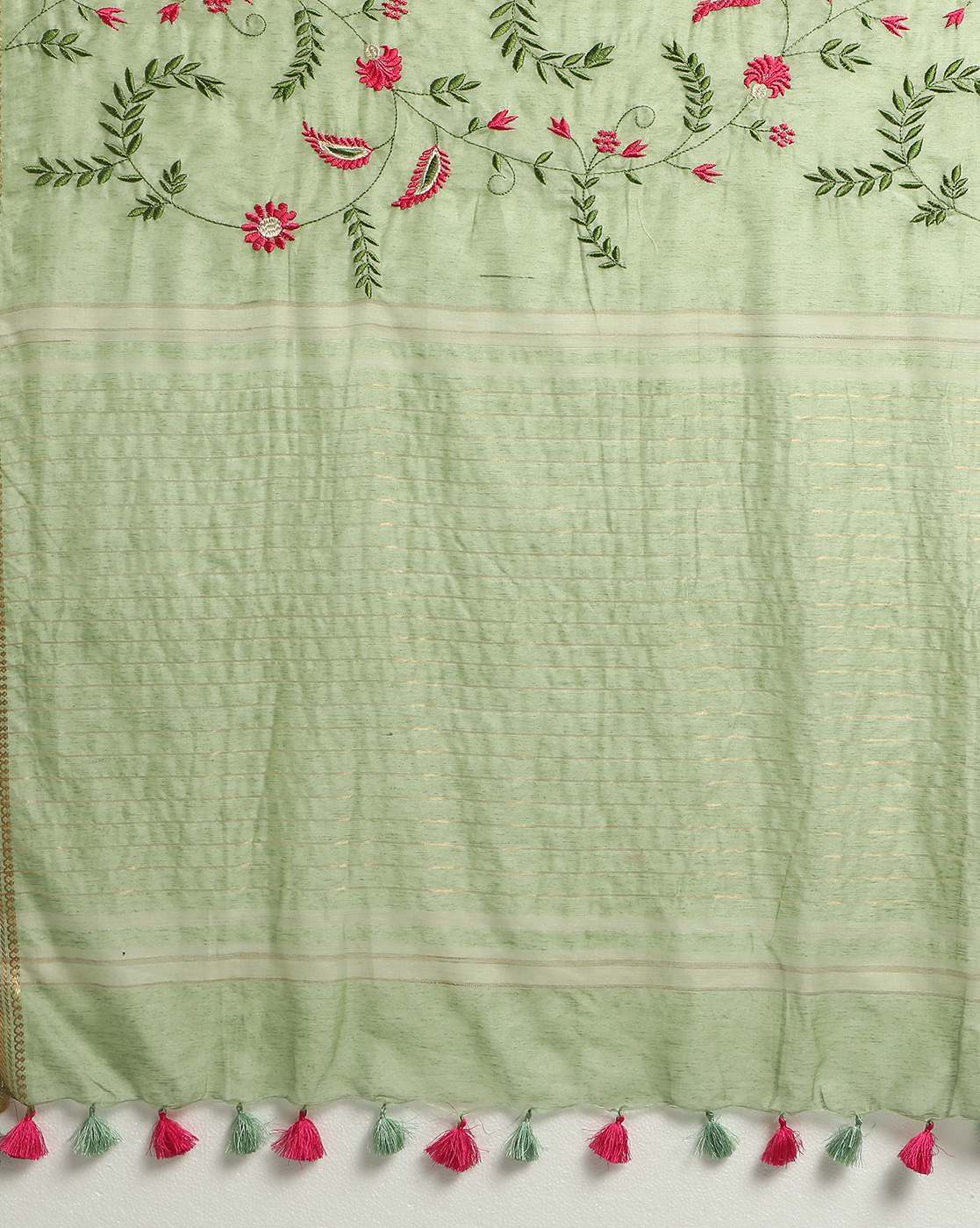 - Yellow linen silk saree has floral embroidered pattern, the pallu has tasseled hem