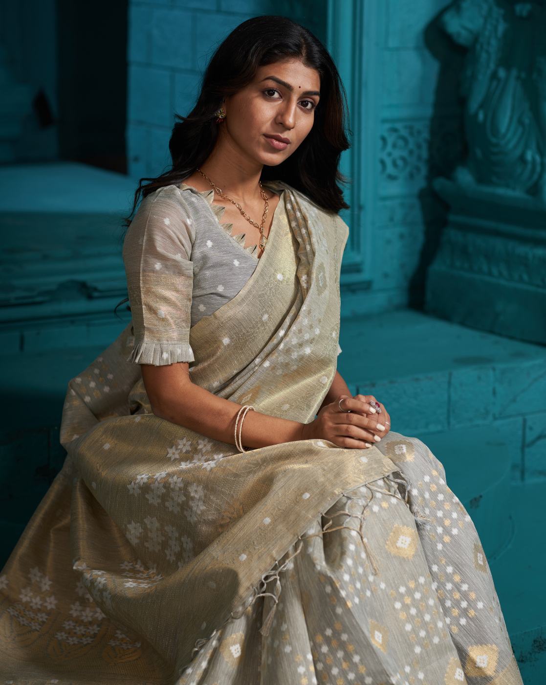 Sarah Idhika Cotton Saree, Grey Colour, Abstract Pattern, Unstitched Blouse Saree