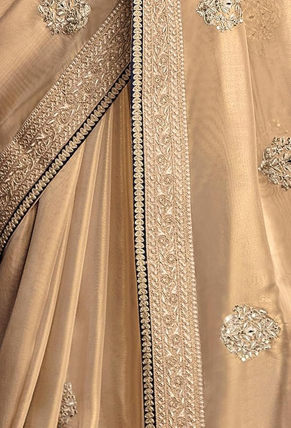 Shimmer Net Gold-coloured saree featuring an all-over heavy gold zari butta and sequence work on body decorated with border with contrast navy blue piping