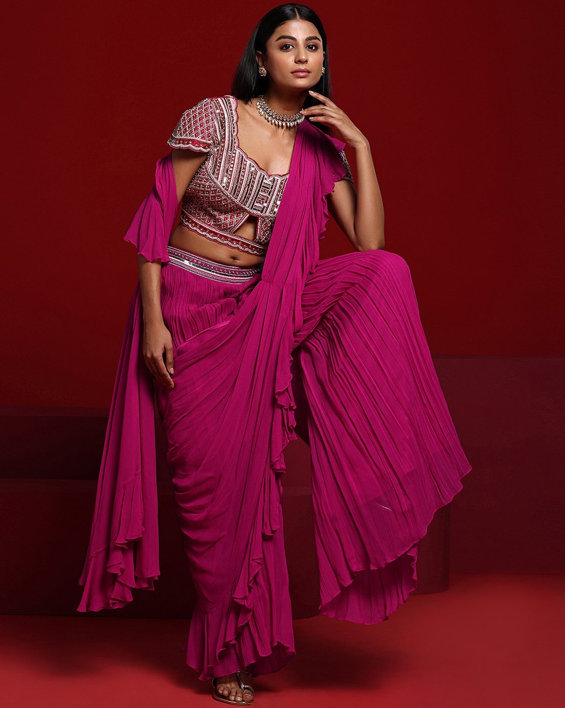 - The last image gives a detailed look of the blouse piece that comes with this saree (The model is wearing a blouse from our in-house wardrobe)