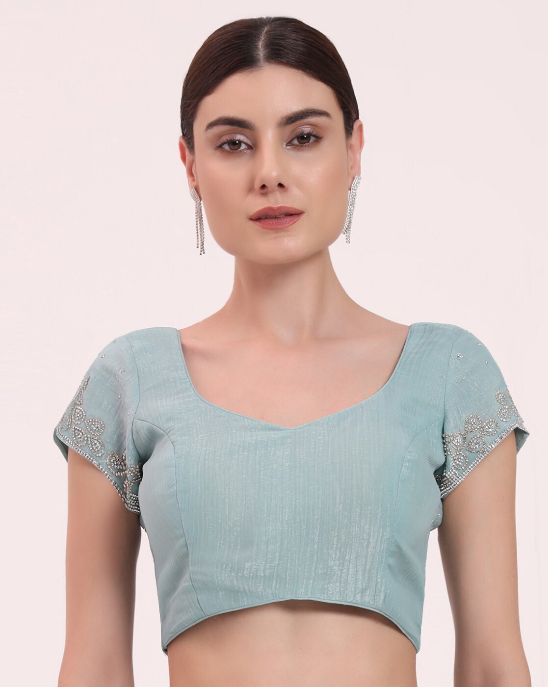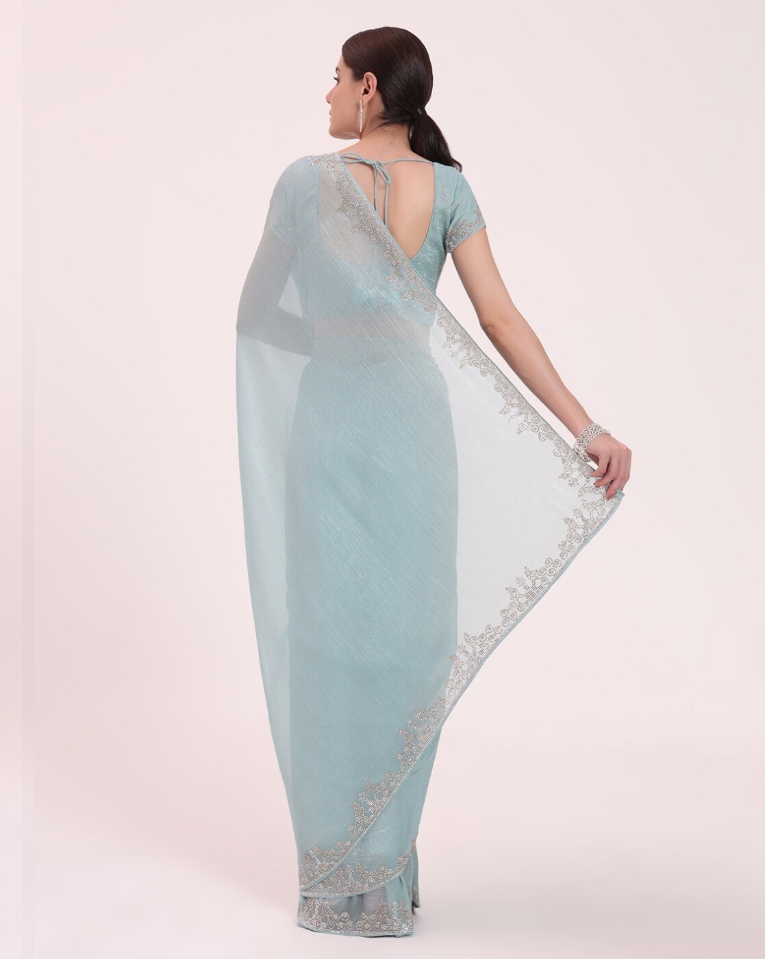 • The last image gives a detailed look of the blouse piece that comes with this saree (The model is wearing a blouse from our in-house wardrobe)