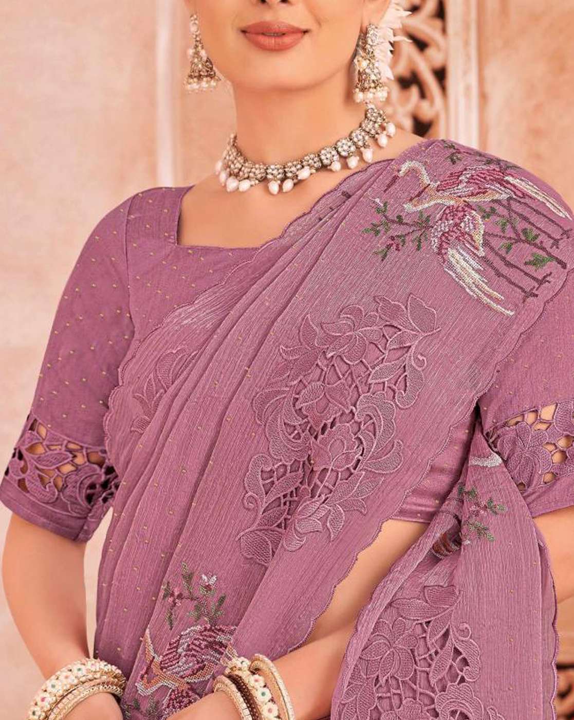 - The last image gives a detailed look of the blouse piece that comes with this saree (The model is wearing a blouse from our in-house wardrobe)
